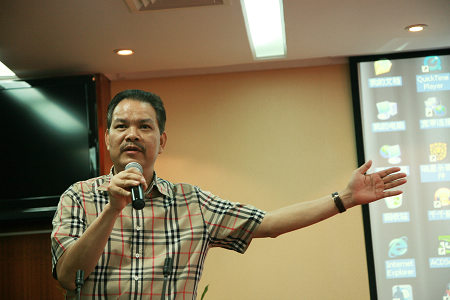 圖為集團總裁勞建銘在培訓會上指導員工