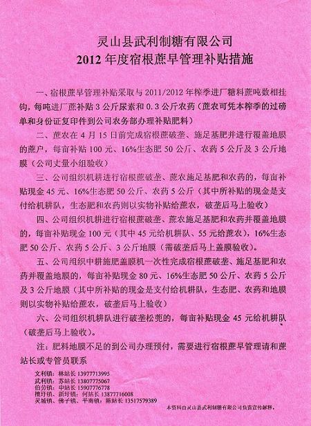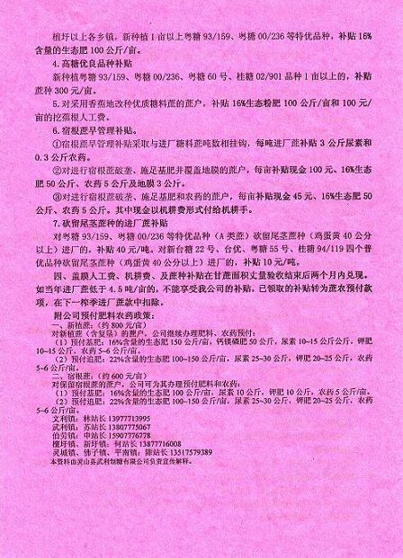 (三)公司組織機耕進行宿根蔗破壟、蔗農施足基肥和農藥的,每畝補貼現金45元、16%生態肥50公斤、農藥5公斤(其中所補貼的現金是支付給機耕隊,生態肥和農藥則以實物補貼給蔗農,破壟后馬上驗收)