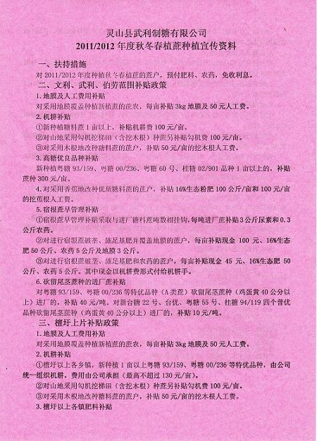 (1)檀圩以上各鄉鎮,新種植1畝以上粵糖93/159、粵糖00/236等特優品種,由公司統一組織機耕,費用由公司承擔(最高不超過130元/畝)。