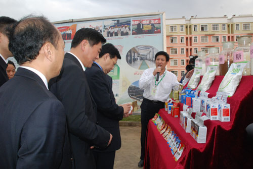 湘桂公司總經(jīng)理莫江向考察團一行介紹湘桂集團產(chǎn)品。