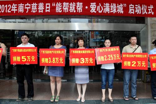 為弘揚中華民族扶貧濟困和南寧城市精神,倡導“以人為本、樂于奉獻”的互助精神,6月8日上午,南寧市青秀區在青秀大廈前舉行2012年“南寧慈善日”暨“能幫就幫·愛心滿綠城”活動捐贈儀式。青秀區區長錢健在捐款儀式上作動員講話,錢區長指出,“慈善一日捐”活動是擴大慈善資金規模、關愛弱勢群體的重要途徑,是奉獻愛心、扶貧濟困的有效平臺,廣大機關干部、企事業單位干部職工、非公企業要積極參與到“能幫就幫·愛心滿綠城”活動中來,能幫就幫,敢做善成,為慈善事業的發展貢獻力量。廣西湘桂糖業集團有限公司副總裁刁曉代表集團總部舉牌捐款3萬元,企業認捐所有款項已匯至南寧慈善總會。