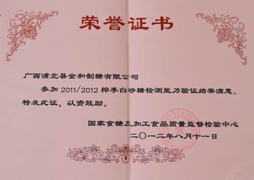 近日獲悉,湘桂集團下屬子公司廣西浦北縣金和制糖有限公司(以下簡稱“金和公司”)榮獲國家食糖及加工食品質(zhì)量監(jiān)督檢驗中心認(rèn)定的“2011/2012榨季白砂糖檢測能力驗證結(jié)果滿意”榮譽稱號。