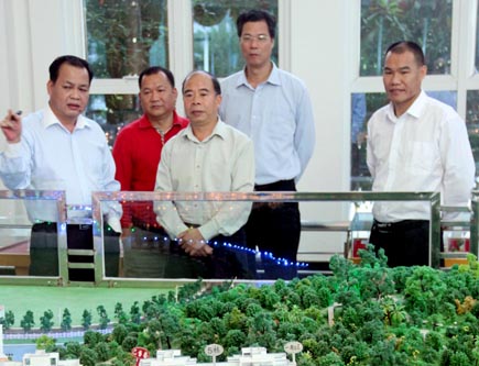 鄭世豐(中)一行聽取鄧豪(左一)關于湘桂·盛世名城建設情況匯報。