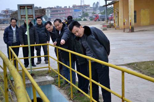 靈山縣委副書記方建安(右一)查看武利公司循環(huán)沉淀池。