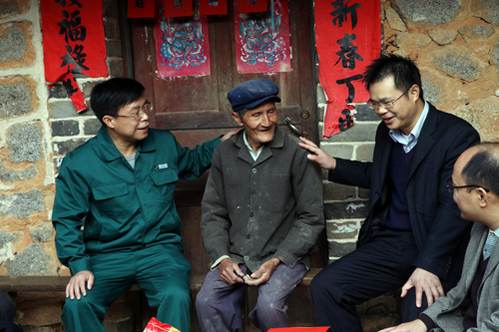 集團監事張守輝(左)、浦北湘桂公司總經理羅成武(右二)與老人親切交談。