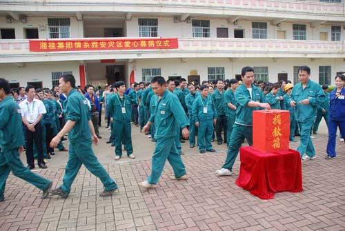4月22日,湘桂集團總部和各下屬公司相繼舉行愛心募捐活動,倡議全體員工為災區捐款,以實際行動為災區同胞獻出愛心,伸出援手。在集團總部及各下屬子公司舉行的募捐儀式上,集團公司向廣大員工提出倡議:“從汶川到雅安,這是一個民族的砥礪!面對無情的災害,唯有愛是幫助災區人民撫平傷痛的力量。讓我們伸出援助之手,用愛心直面悲情,用愛撫平傷口,用我們的點滴真情,給災區人民帶去一份溫暖和希望?!奔瘓F廣大員工積極響應倡議,踴躍捐款。