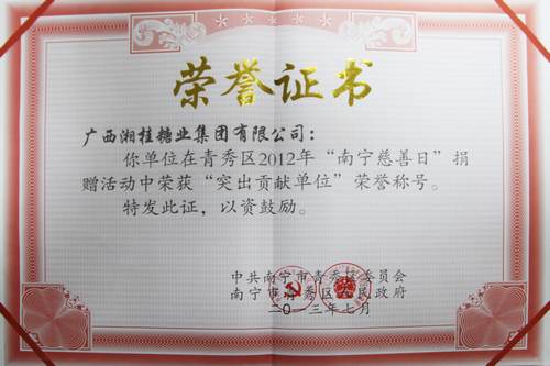 在2012年“南寧慈善日”暨“能幫就幫·愛心滿綠城”活動捐贈活動中,湘桂集團認捐3萬元,受到社會各界的普遍好評。2013年,集團將以獲此榮譽為契機,繼續(xù)秉承“回饋社會、奉獻國家”的經(jīng)營宗旨,在做好企業(yè)經(jīng)營的同時,勇于擔當社會責任,積極投身于社會濟困、扶貧、助學等各項公益事業(yè)中,努力為慈善事業(yè)貢獻一份力量。