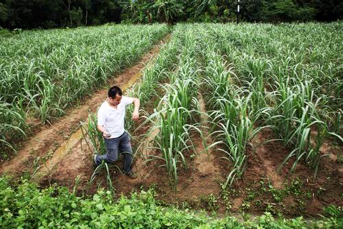 靈山湘桂公司副總經理劉丕慶查看甘蔗生長情況。