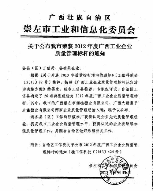 近日獲悉,湘桂集團下屬子公司廣西崇左市湘桂糖業有限公司(簡稱崇左湘桂公司)榮獲由自治區工信委評比授予的“2012年度廣西工業企業質量管理標桿”榮譽稱號。