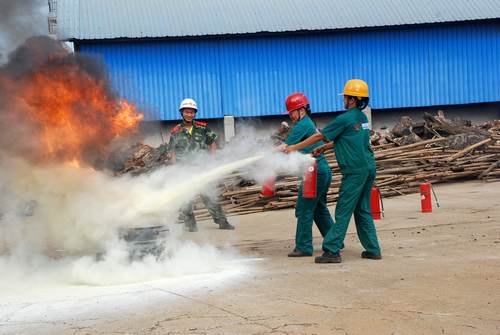 員工在消防官兵的指導(dǎo)下,練習(xí)用滅火器撲滅火源。