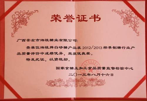 近日獲悉,湘桂集團(tuán)下屬子公司廣西崇左市湘桂糖業(yè)有限公司(簡(jiǎn)稱(chēng)崇左湘桂公司)產(chǎn)品“湘桂”牌一級(jí)白砂糖榮獲國(guó)家食糖及加工食品質(zhì)量監(jiān)督檢驗(yàn)中心頒發(fā)的“2012/2013榨季制糖行業(yè)產(chǎn)品質(zhì)量?jī)?yōu)良獎(jiǎng)”。