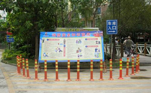 小區(qū)內(nèi)安放的消防安全知識宣傳板。