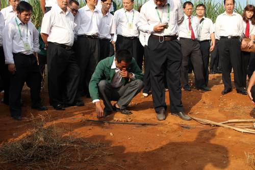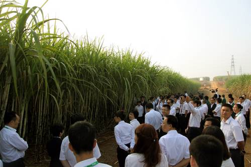 集團總裁向參觀人員介紹了孔香屯甘蔗種植示范基地的發展歷程,并總結了基地在三年建設中取得的經驗??紫阃透收岱N植示范基地是經集團公司外請專業團隊科學規劃建設的甘蔗良種良法示范基地,目前占地2068畝,共有粵糖93/159,粵糖00/236等七個品種。2012/2013年度,基地建設在酵母廢水農灌、采用地埋式滴灌系統、采用寬窄標準化種植方法、基地管理精編增效、甘蔗單產提高2至3噸/畝、利用飛機噴藥六大方面取得了創新突破,每年可為集團公司節約管理人工成本約500萬元,大大降低了企業的環保壓力和風險,進一步提高工作效率,真正實現了種、管、收全程機械化,水、肥、藥一體化,病蟲害統防統治等“六化” (機械化、水利化、集約化、智能化,標準化,良種化)建設,使示范基地真正起到了示范的作用,充分體現了湘桂循環經濟“資源節約、環境友好”的理念。