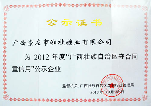 近日獲悉,湘桂集團(tuán)下屬子公司廣西崇左市湘桂糖業(yè)有限公司(簡稱崇左湘桂公司)獲自治區(qū)工商局授予2012年度“廣西壯族自治區(qū)守合同重信用”企業(yè)稱號。