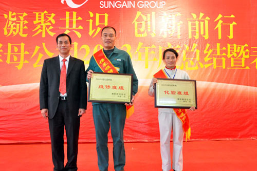 集團總裁助理勞雪梅、馮小兵為2013年度酵母公司最佳業績業務員頒獎。