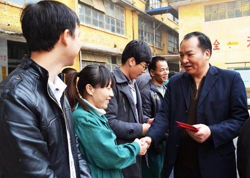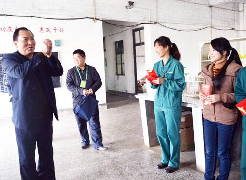 靈山湘桂公司副總經理王文達給制煉車間員工送上節日紅包。
