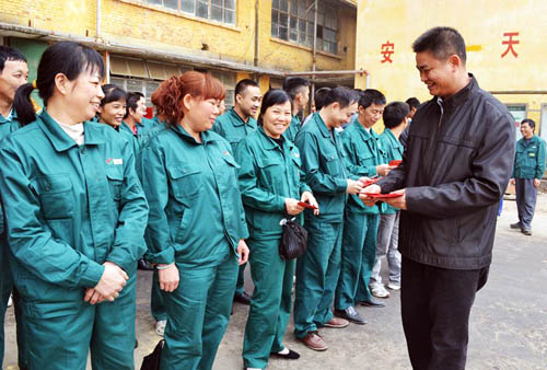 靈山湘桂公司總經理滕家偉給制煉車間員工送上節日紅包。