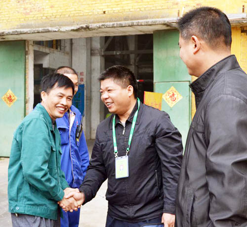 在各車間,滕家偉一行的到來,引起了一陣陣歡騰。員工們個個興高采烈、洋溢著笑容,或列隊鼓掌,或圍攏暢言,紛紛表達對公司美好前景的祝愿。滕家偉與員工們一一握手問好,并向他們詳細詢問了解機器設備的運行狀況、生產的進展、指標的完成情況等,對他們在春節期間仍堅守崗位第一線進行清洗及檢修機器設備表示贊許和感謝,同時勉勵大家要牢牢抓住“天時、地利、人和”的有利條件,“搶”字當頭,快馬加鞭,緊緊咬定目標不放松,加快推進砍運榨種各項生產工作的步伐,以繼往開來開拓進取的創新精神攀升新高度,打開新局面,贏取馬年的新勝利。