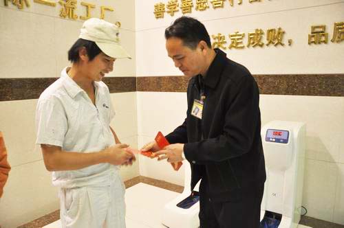 酵母公司行政人事部副經理何華曉向員工派發新年紅包。