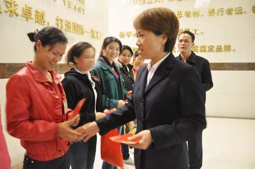 2014年2月7日,農歷大年初八下午,湘桂集團下屬子公司廣西湘桂酵母科技有限公司(以下簡稱“酵母公司”)領導分別到各部門辦公室、車間給員工拜年并派發開年利是。