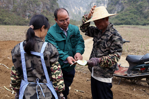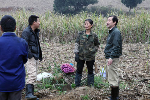 集團督察中心副主任香克非(左二),人力資源中心副經理岑春蘭(左三)到田間地頭推廣公司甘蔗扶持政策。