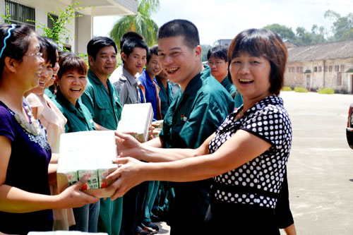 浦北縣總工會副主席許敏(左一)為員工發放清涼飲料。