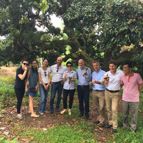 樂斯福大中國區總裁蒲建菲先生(右四)一行在湘桂集團董事、副總裁刁曉女士(中間)的陪同下到靈山最壯觀的荔枝園品嘗名貴美味荔枝。