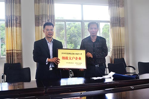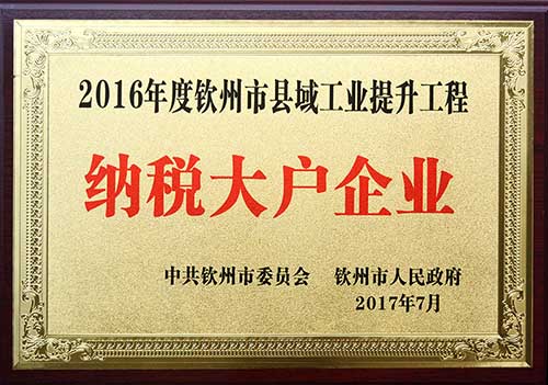 圖為浦北湘桂公司被中共欽州市委員會、欽州市人民政府授予2016年度欽州市縣域工業提升工程“納稅大戶企業”稱號。