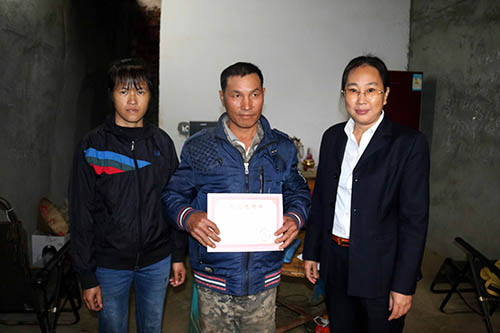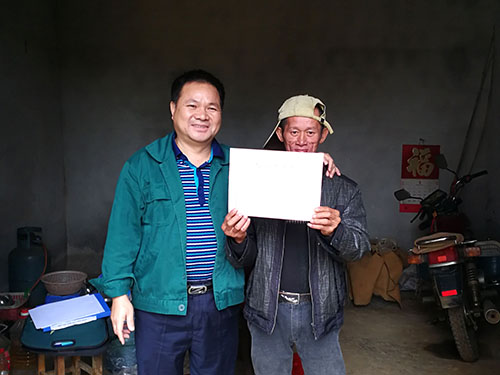 圖為崇左湘桂公司扶貧小組給凌福強(qiáng)送上脫貧光榮書。