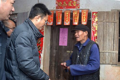 圖為浦北湘桂公司黨委書(shū)記、總經(jīng)理羅成武向蔗區(qū)孤寡老人送上新春慰問(wèn)。