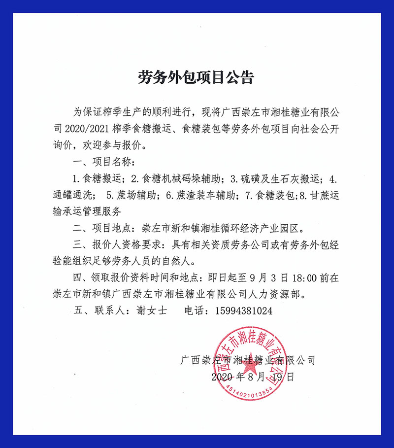 廣西崇左市湘桂糖業(yè)有限公司勞務(wù)外包項目公告