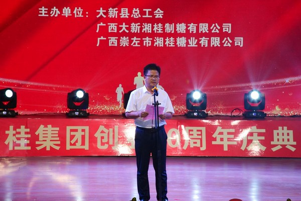 黃漢忠在講話中對湘桂集團創業發展20年來所取得的成績表示充分肯定,他說,湘桂集團自2000年扎根大新、扎根崇左經營發展以來,認真貫徹崇左市、大新縣各級黨委、政府的工作部署,依托企業自身優勢,大力發展甘蔗生產,積極承擔社會責任,在扶持發展甘蔗種植管護、蔗區道路維修、農資補貼、機械化推廣、技術服務等方面投入了大量人力、物力和財力,積極推進甘蔗“雙高”基地建設和訂單農業,帶動當地農民就業、脫貧、增收,助力精準扶貧工作,在糖業節能降耗、降本增效、做強做優蔗糖循環經濟產業等方面取得了突出成績,為推動大新縣乃至崇左市蔗糖產業發展及打贏脫貧攻堅戰、實現“六保”“六穩”任務作出了積極的貢獻。黃漢忠表示,大新縣雷平鎮將一如既往地關心關注民營企業的發展,積極為民營企業提供全方位的服務、支持和幫助,營造良好的營商發展環境。希望湘桂集團以創業發展二十周年為契機,繼續堅定糖業生產發展不動搖,加大改革創新、技術升級,進一步降本增效,不斷提升企業自身競爭實力和經濟效益,做好“六穩”“六?!鄙?。