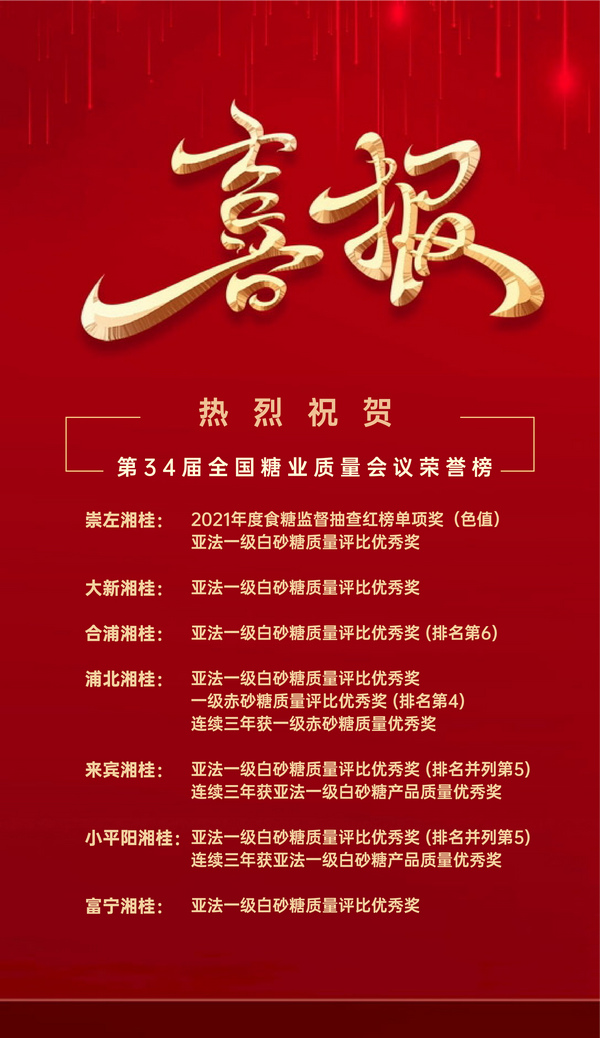 本次大會緊扣質量主題,組織開展了大會主題報告、標委會換屆成立、企業糖樣觀摩、糖標委年會標準修訂研討以及2021/2022年制糖期全國食糖質量檢測評比活動,來自全國137家制糖企業的200多個食糖產品參與評比,根據食糖產品質量行業管理辦法、糖檢中心理化指標等,經現場參會專家嚴格評選,湘桂集團下屬7家制糖企業的食糖品牌產品共獲國家糖業質量評比12個獎項。