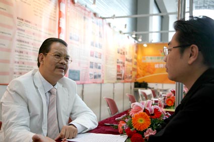 湘桂集團董事局主席勞建銘(左)參加招聘會并親自考核應聘者。
