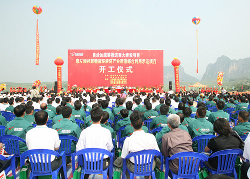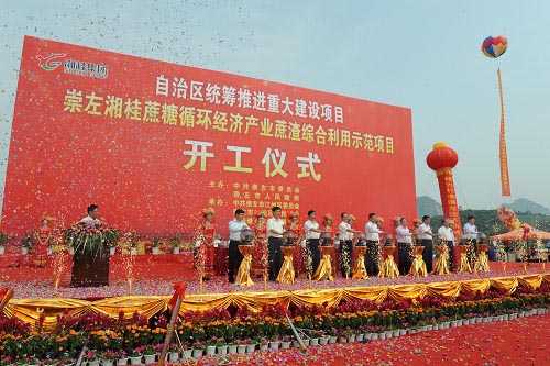 圖為湘桂集團(tuán)年產(chǎn)9.5萬噸蔗渣綜合利用示范項(xiàng)目開工儀式現(xiàn)場