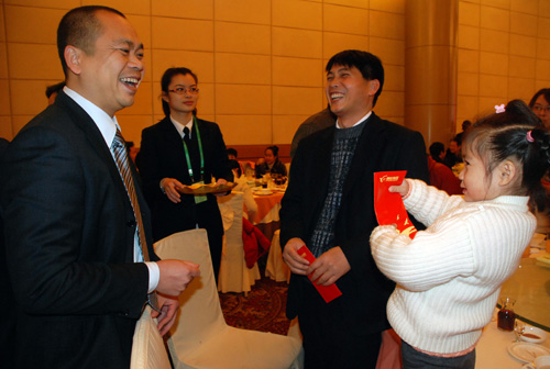 集團董事局主席、總裁勞建銘在團拜會上發紅包。