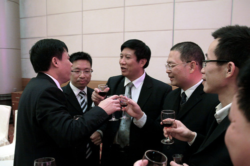集團董事、副總裁勞創禹(右3)、集團副總裁刁曉(右2)向員工敬酒并致以新春祝福。