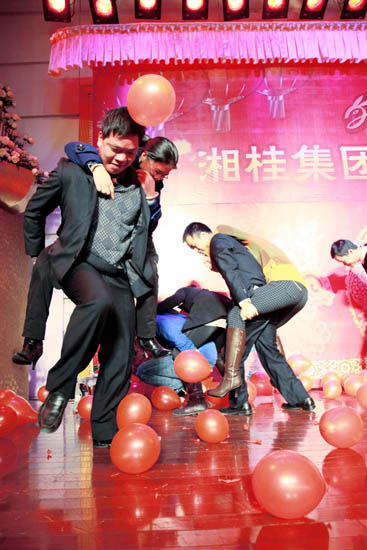 團拜會后半程,喜氣洋洋的歌舞拉開了團拜會晚會的序幕。由集團員工自編自演、精彩紛呈的合唱及舞蹈等節目引來陣陣掌聲,穿插其中的游戲環節一次又一次將晚會推向高潮,展現了湘桂人活躍的企業文化。