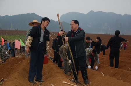圖為崇左市委副書記盧萬兵(右一)在種植活動現場。