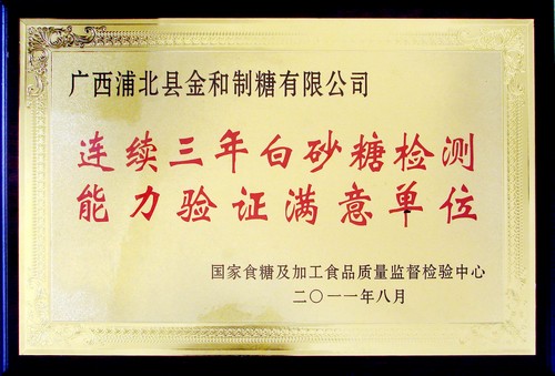 近日,湘桂集團(tuán)下屬子公司廣西浦北縣金和制糖有限公司(以下簡(jiǎn)稱金和公司)在2010/2011榨季生產(chǎn)的“桂興牌”一級(jí)白砂糖榮獲國(guó)家食糖及加工食品質(zhì)量監(jiān)督檢驗(yàn)中心頒發(fā)“亞硫酸法糖優(yōu)良獎(jiǎng)”及“連續(xù)三年白砂糖檢測(cè)能力滿意單位”等稱號(hào)。