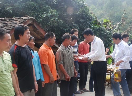 集團董事局副主席陳輝(右二)代表湘桂集團向蔗農發放慰問金及慰問品。