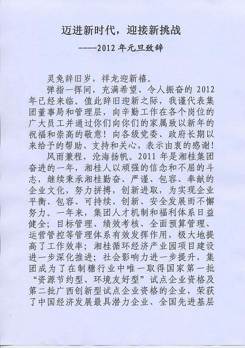 邁進新時代,迎接新挑戰----集團董事局主席、總裁勞建銘先生2012年元旦致辭