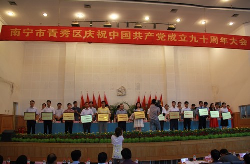 為隆重紀念中國共產黨九十周年華誕,繼承和發揚黨的優良傳統,表彰先進,樹立榜樣,6月30日,南寧市青秀區黨委對2010年以來取得優異成績的先進基層黨組織及先進個人予以表彰,湘桂集團榮獲“南寧市青秀區先進基層黨組織”稱號。