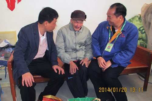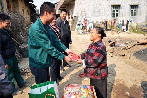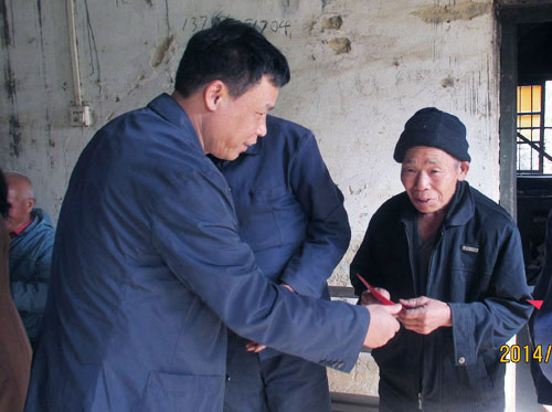 集團監事會監事長陳輝給敬老院孤寡老人送上慰問金。