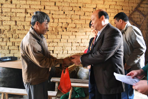 集團董事、靈山湘桂公司副總經理劉丕慶給困難蔗農送上新春慰問品和慰問金。