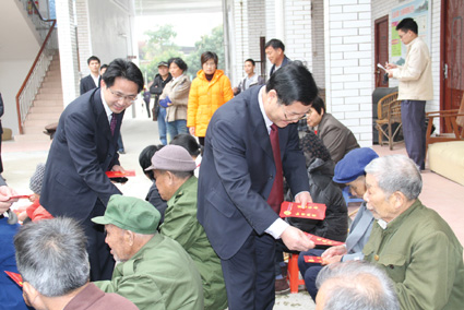 在縣城光榮院、福利院,黃為政及鄧豪、黃建軍為老人們送上了長壽面、大米、花生油、白糖、桌球臺等慰問品及慰問金,向他們表達了節日的問候和祝福;湘桂房地產公司總經理賴小丁、集團監事及湘桂房地產公司副總經理姚禮信一一為老人們奉上新年紅包,祝福老人們在新的一年里生活幸福,健康長壽。當得知福利院還有一位106歲的老人因身體原因不能到達現場時,慰問團一行來到了老人居住的宿舍,看望了這位高齡的老人。當老人知道縣領導及湘桂集團領導來看望她時,非常感動,激動的表示感謝黨和政府及湘桂集團對她的關心。集團董事、副總裁鄧豪與老人親切握手,噓寒問暖,詳細了解老人的生活狀況和健康狀況,為老人送上了慰問金,囑咐老人要注意身體,祝福老人健康長壽,新春愉快,幸福吉祥。為感謝湘桂集團一直以為對靈山縣孤寡老人的關照,縣城光榮院、福利院為湘桂集團送上了上書“敬老行善,厚德載福”的牌匾,代表敬老院老人,對靈山縣領導及湘桂集團表示感謝。